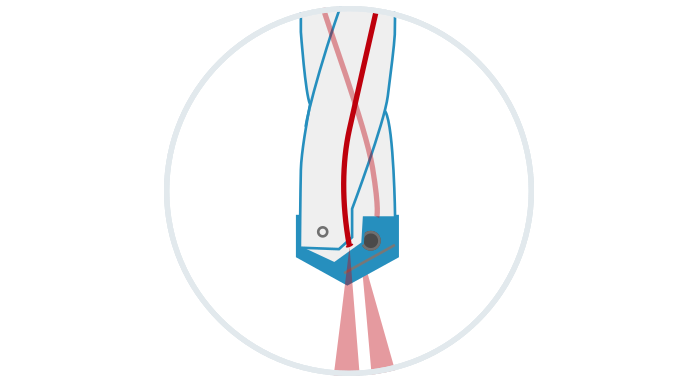 - Durch ausgespitzte Zentrumsschneiden werden die axiale Kräfte bis zu 20% gegenüber konventionellen Bohrern reduziert